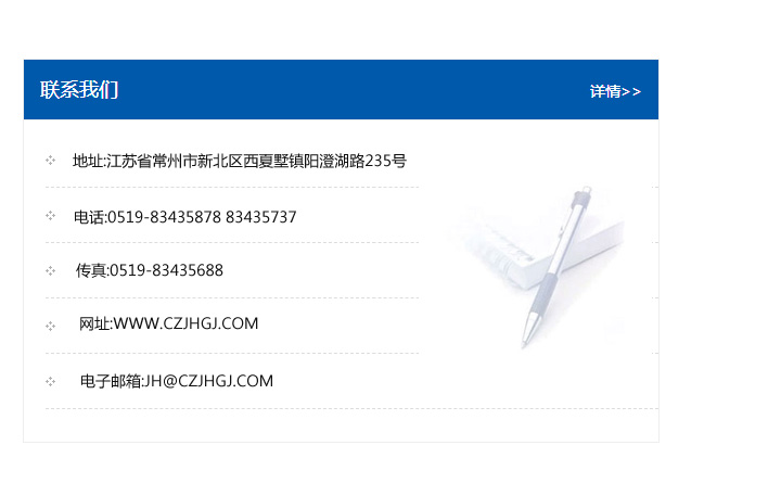 傳真:0519-83435688    郵編:213135    網址:WWW.czjhgj_com.robmt.com    電子郵箱:JH@czjhgj_com.robmt.com